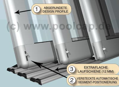 Automatische Segmentpositionierung: Die genaue Stellung der Segmente zueinander muss in der Position zu den Elementen gegeneinander abgedichtet und an entsprechender Stelle gesichert werden. Dies wird durch einen Federbolzen gewährleistet, der auf einen schräggestellten Kunststoffkeil aufläuft. Durch dieses System ist die Wegrollsicherung gewährleistet und werden Schleifspuren auf den Laufschienen vermieden.